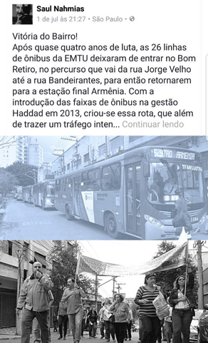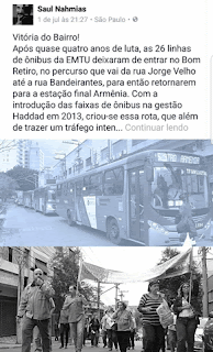7월 3일(19:30) Copom 회관에서 꼰세기Conseg 모임이 있었다. 주요 내용으로는 봉헤찌로 내에 운영되고 있는 버스 노선 26개가 7월 1일자로 봉헤찌로 외각으로 변경되어 운영되게 되었다. 이 안건을 두고 Raul Nahmias씨가 꾸준히 거론하였으며 주민들의 입장을 조사하고 전달한 가운데 시에서는 운행을 멈추게 되었다. 본래 이 버스의 운행은 Armenia를 종점으로 하여 굳이 봉헤찌로 내에 경유를 하여 돌아갈 필요가 없는 것을 2013년 하다지Haddad 시장이 연결 시킨 것이라고 설명했다. 또한 주민들이 그 노선을 얼마만큼 이용하는지에 대한 파악을 전달한 결과 소수의 인원으로 인해 좁은 봉헤찌로 길에 버스를 운행시키는 것이 효과적이지 못하다는 것을 증명했다. 단 몇 블록만 걸으면 찌라덴찌 대로라고 설명하면서 교통 혼잡도 피하고 길거리에 땅꺼짐 현상도 무거운 버스 운행의 영향이라고 주장했다.