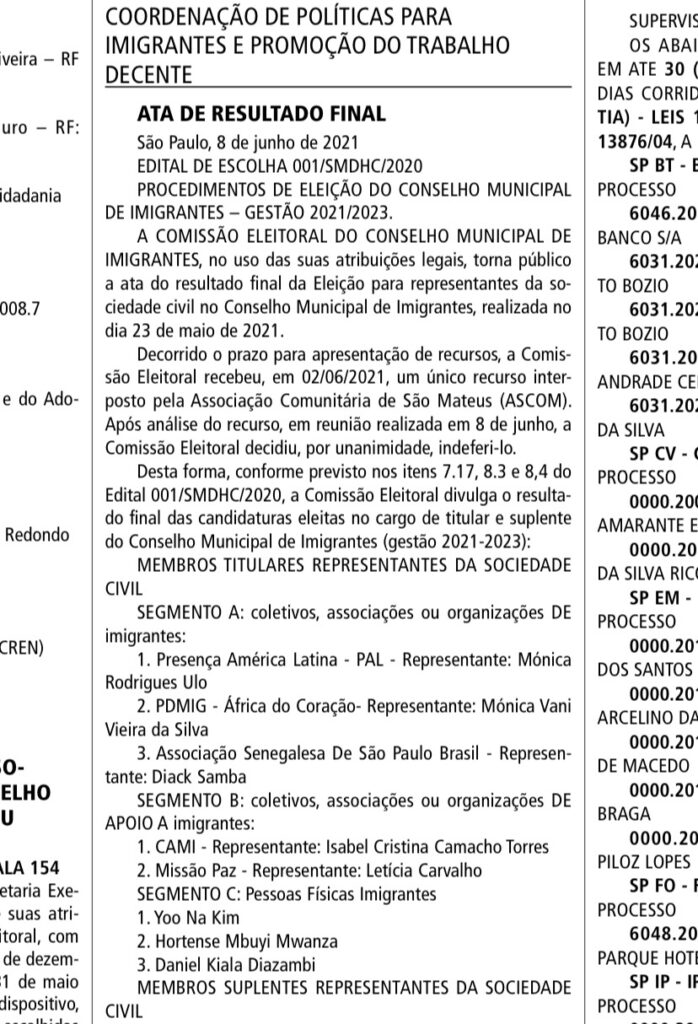 이미 5월 21일 투표 결과가 나왔으나 2주간에 실격 기간을 둔 가운데 9일 관보에 실렸다. 김유나 이민자 대표는 인터뷰에서 “ 한인 여러분 감사합니다. 이번 제 2기 상파울루시 이민자 자문위원회 선거에서 8명의 당선자중 득표수 1위로 당선한 김유나입니다. 앞으로 2년의 임기 동안 한인 사회에 더욱 힘이 될 수 있도록 노력하겠습니다. 항상 여러분의 목소리에 귀 기울이는 이민자 대표가 되겠습니다. 여러분의 성원에 다시 한번 감사드립니다. “ 라고 전했다.